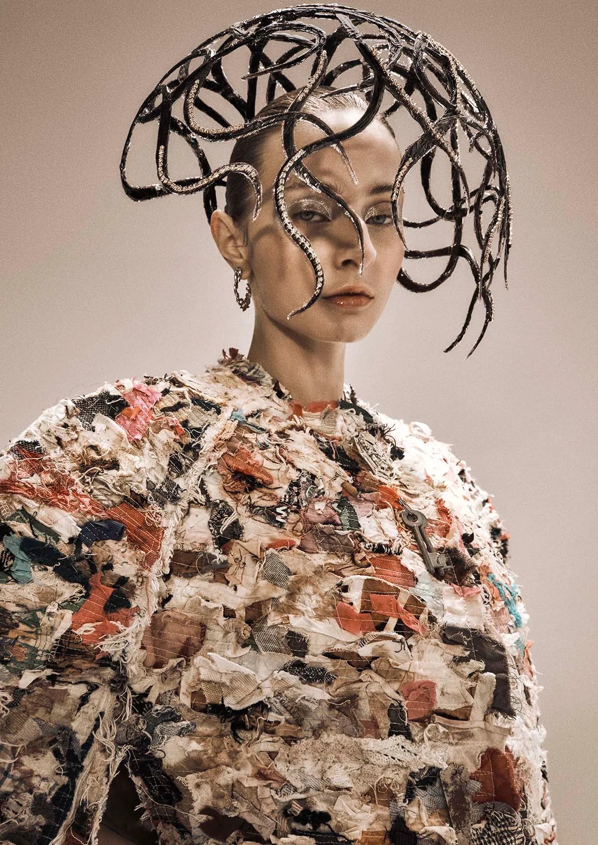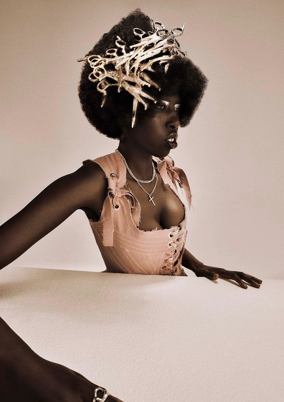Armadura de cuentas, esculpida como una reliquia, lucida como un símbolo de rebeldía.