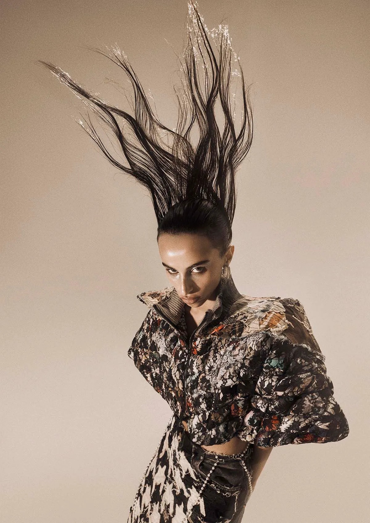 Cabello esculpido en líneas nítidas y brillantes, que captan la luz como las facetas de una piedra preciosa.