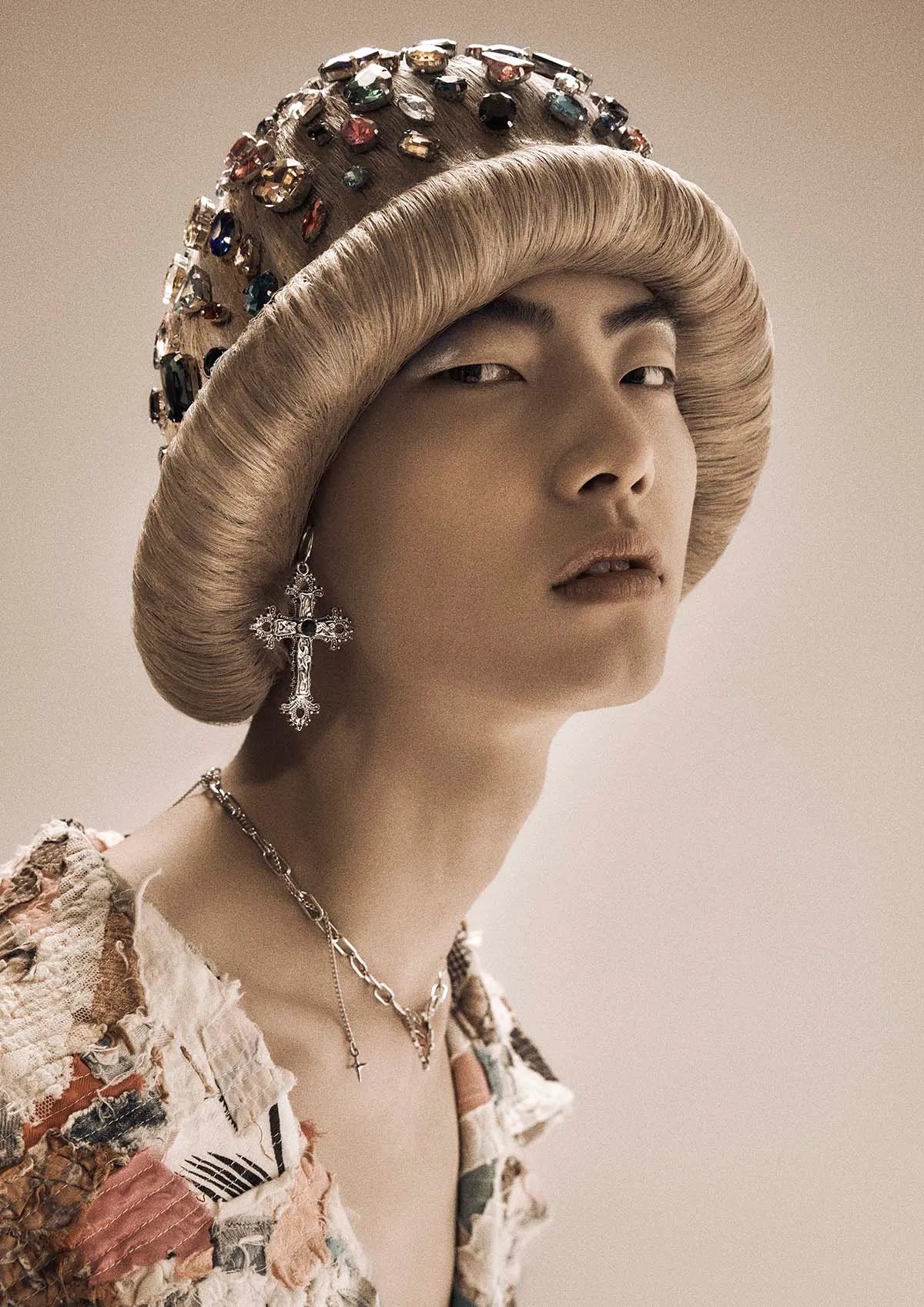 Cabello esculpido como terciopelo, coronado con gemas que captan la luz desde todos los ángulos.