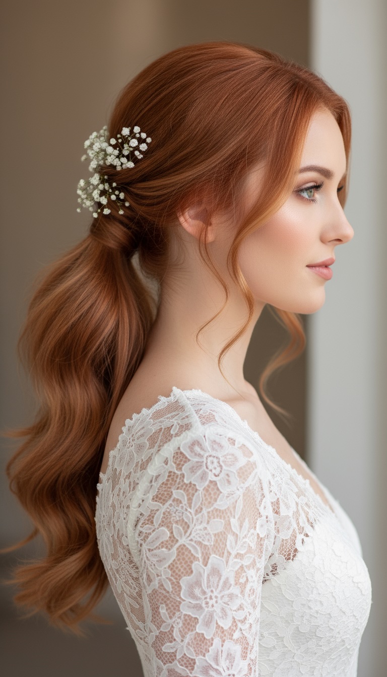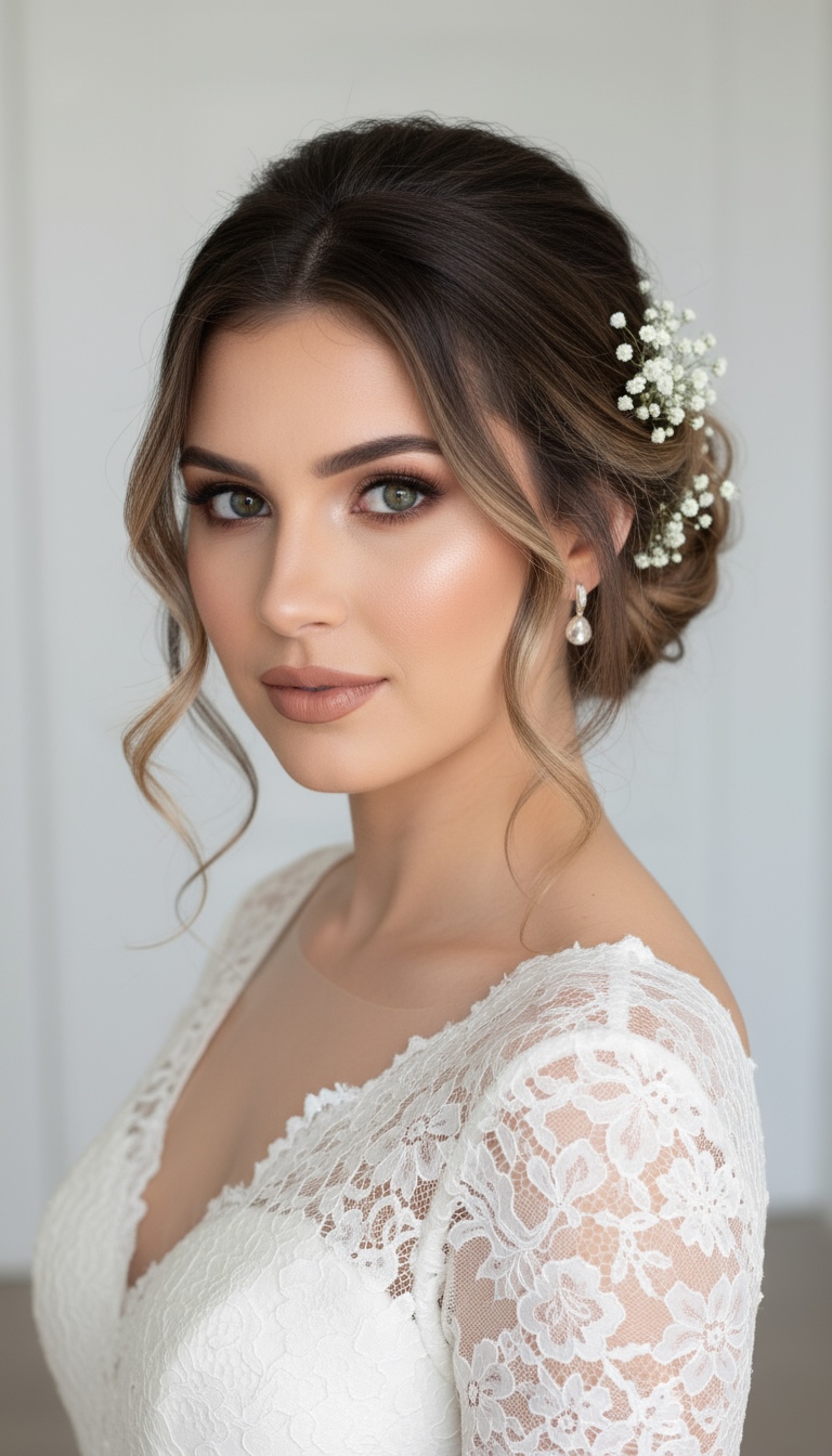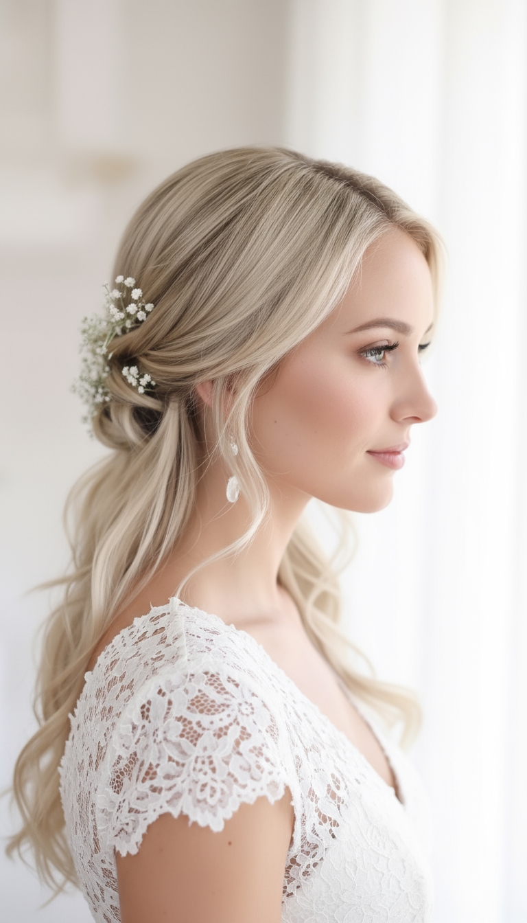 Pequeñas flores blancas integradas de forma natural, casi espontánea, como parte del peinado y no como un accesorio impuesto.