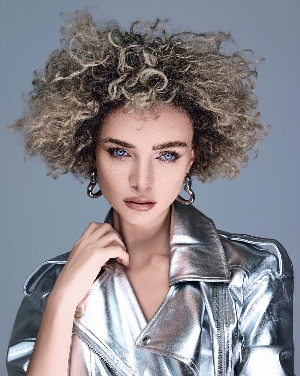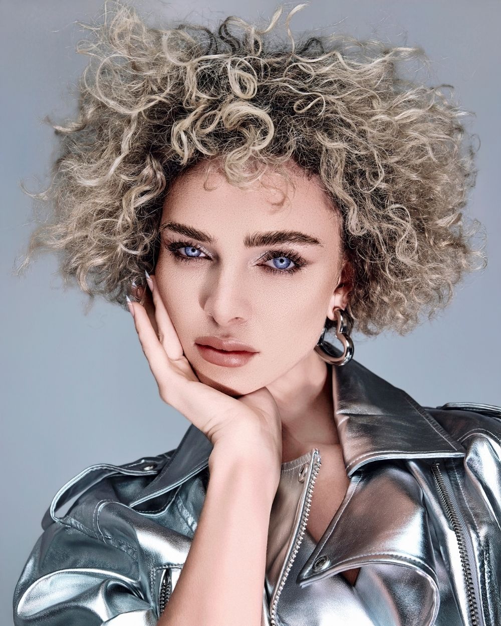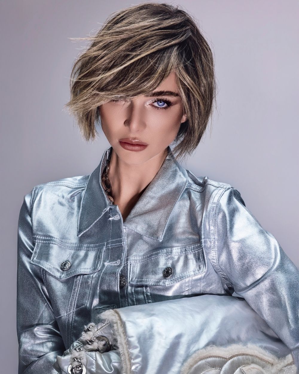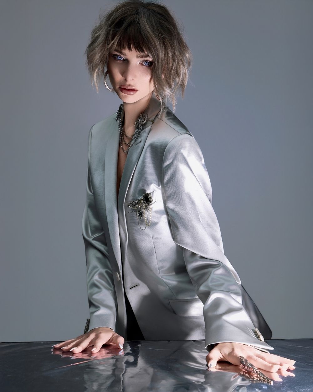 La atmósfera es mineral, luminosa, casi futurista. El cabello captura la luz como una joya, oscilando entre la fuerza y la fragilidad, el control y la entrega.