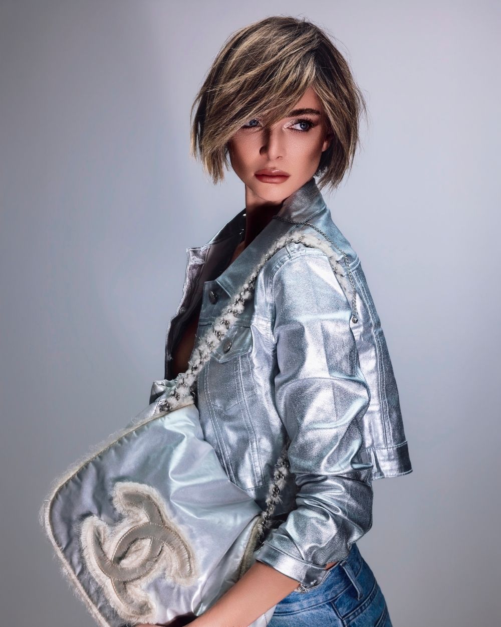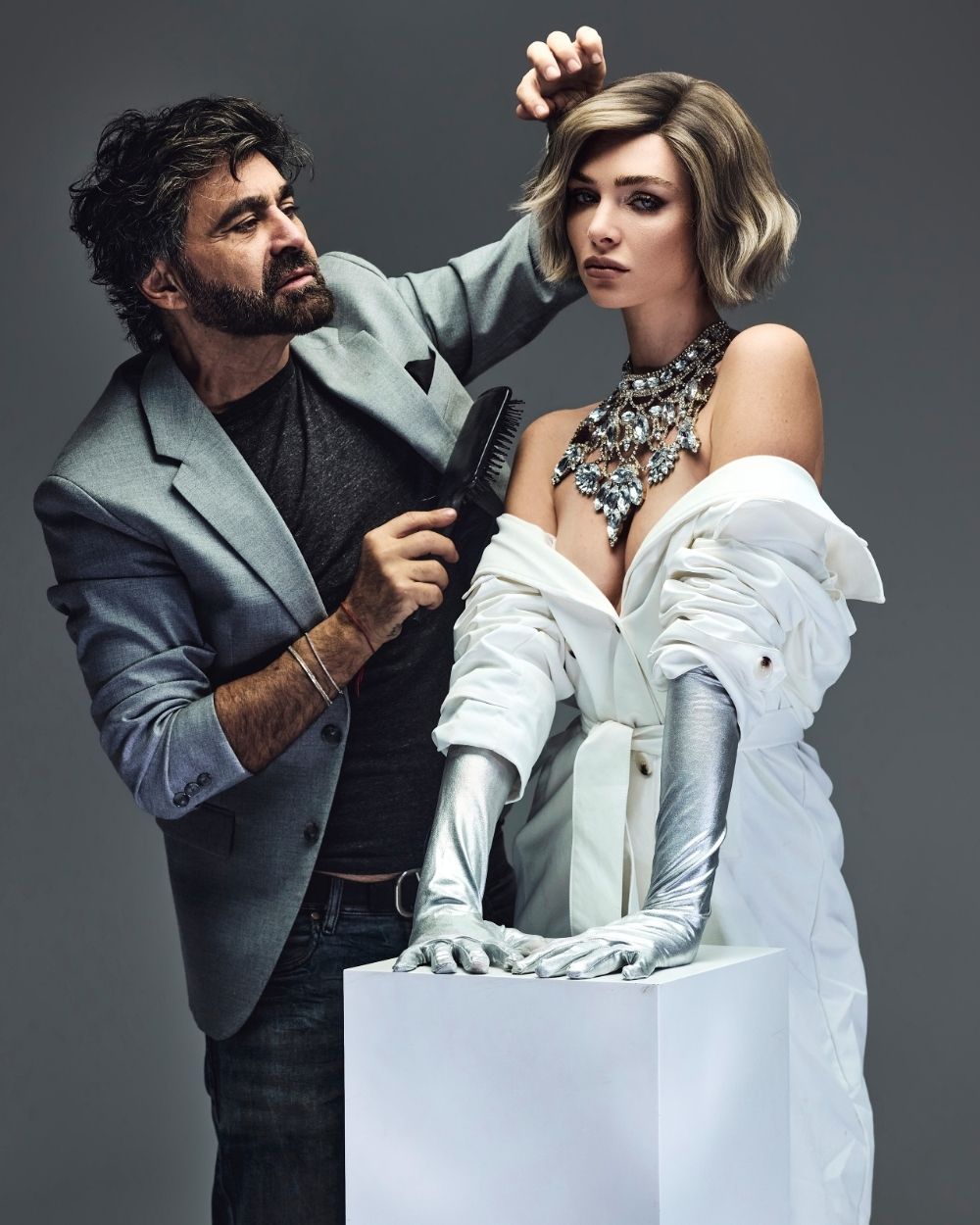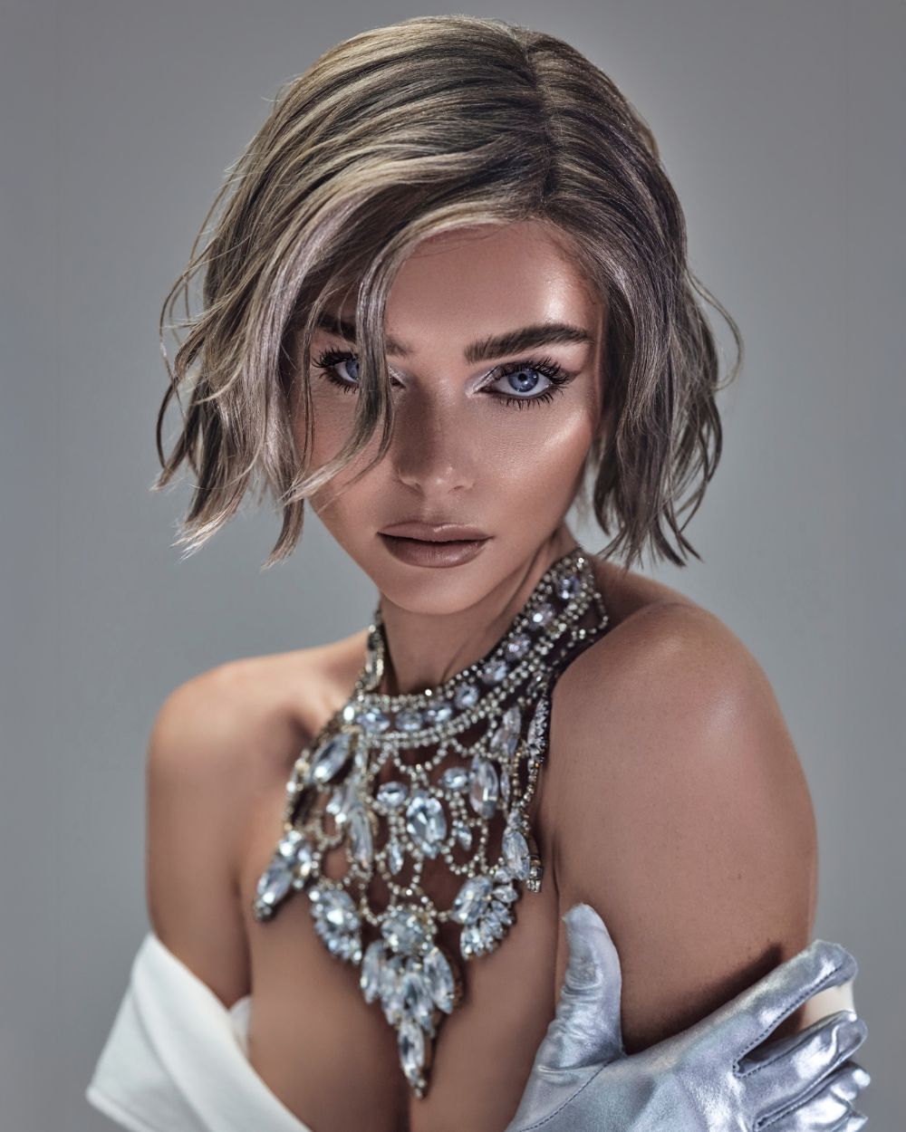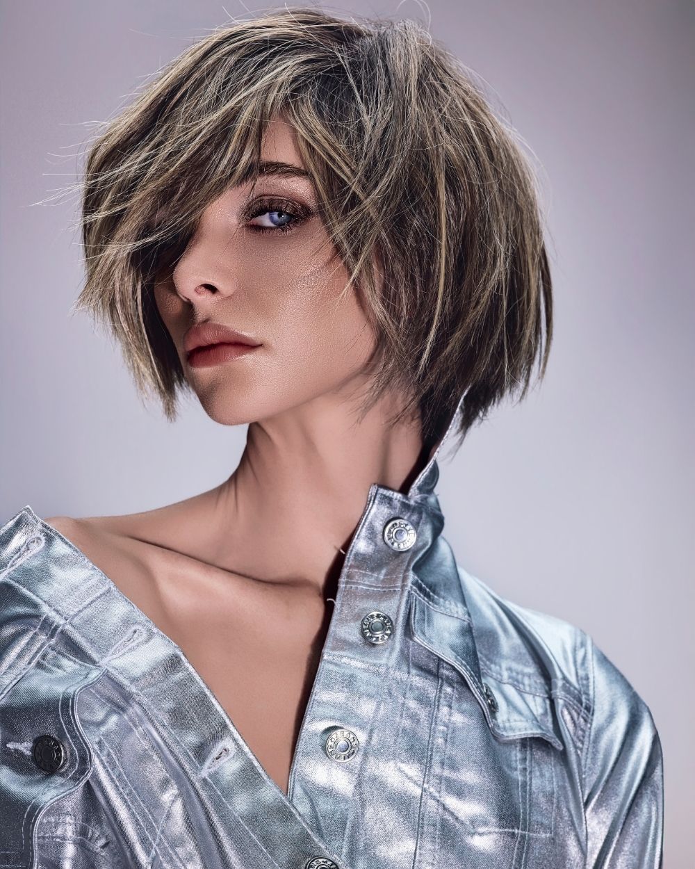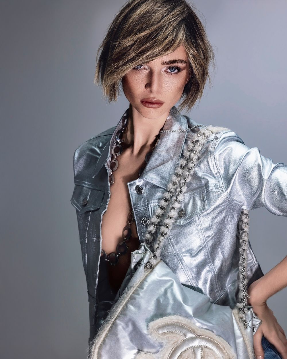 La atmósfera es mineral, luminosa, casi futurista. El cabello captura la luz como una joya, oscilando entre la fuerza y la fragilidad, el control y la entrega.