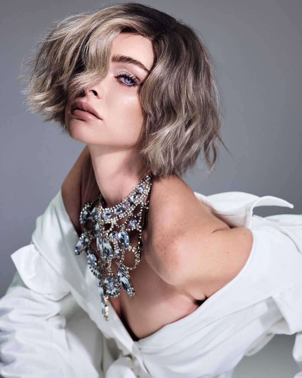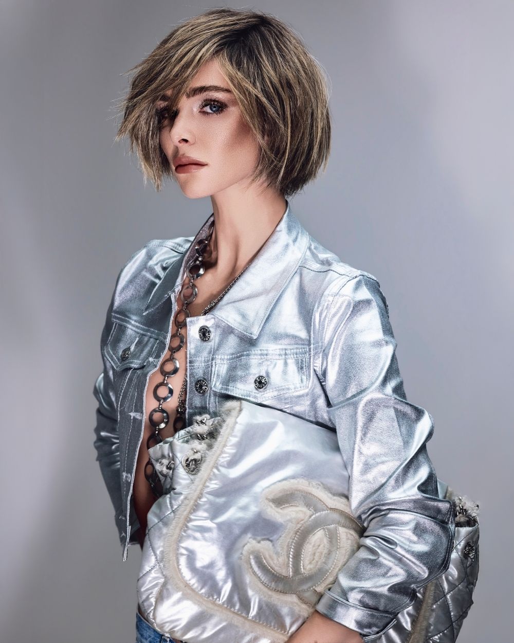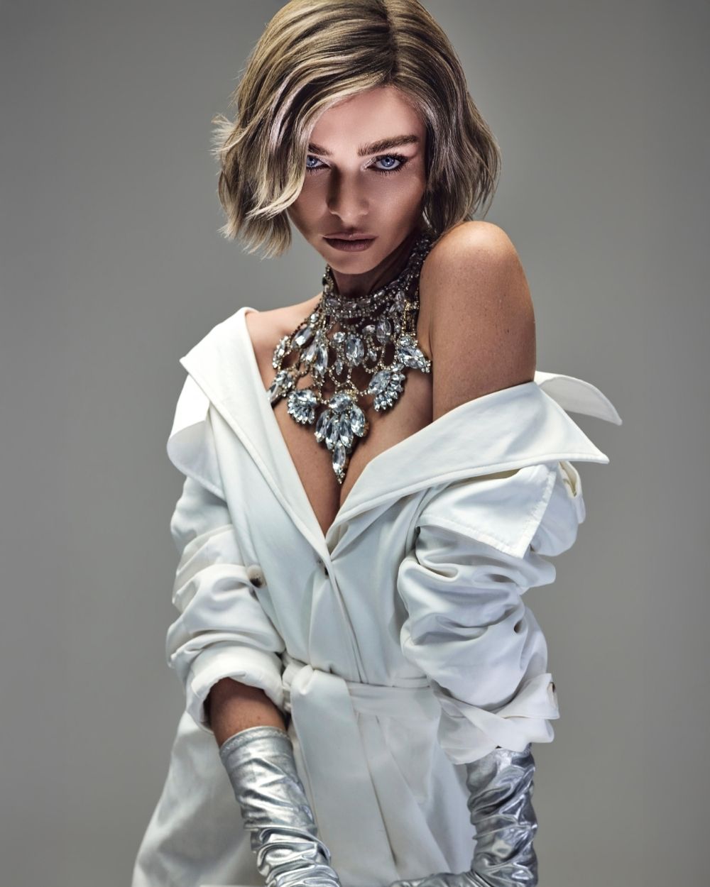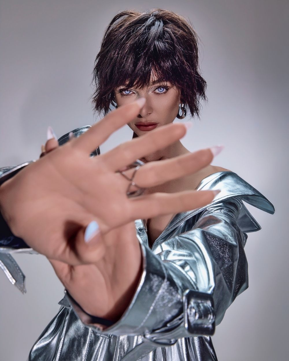La atmósfera es mineral, luminosa, casi futurista. El cabello captura la luz como una joya, oscilando entre la fuerza y la fragilidad, el control y la entrega.