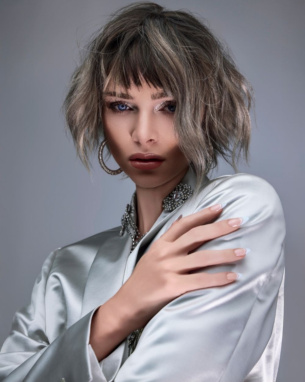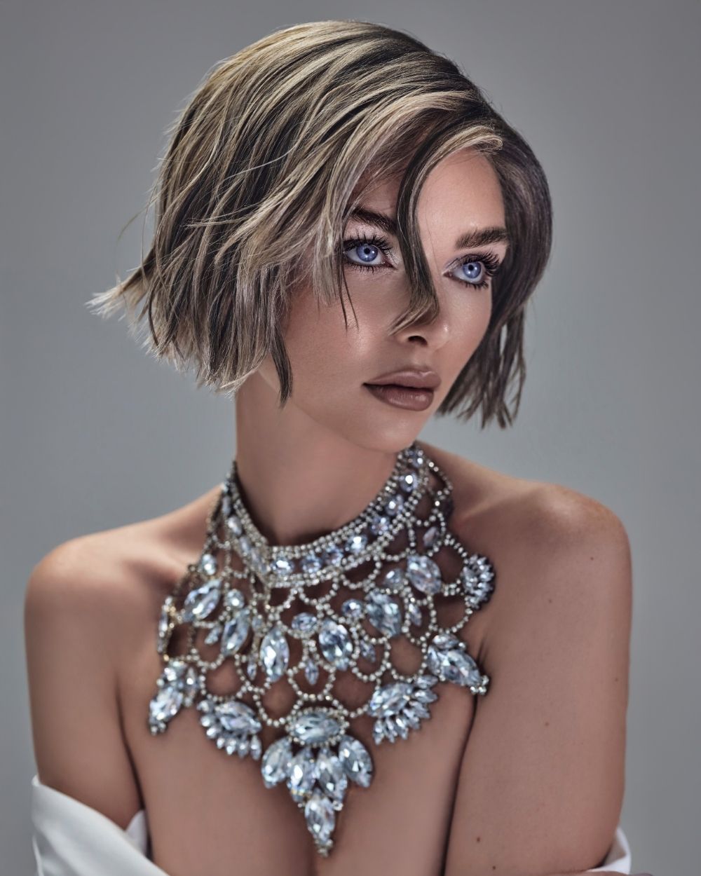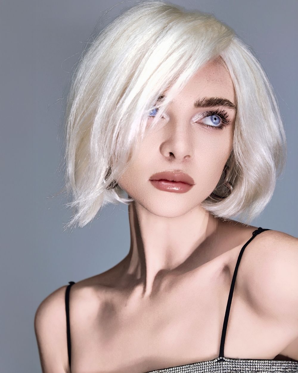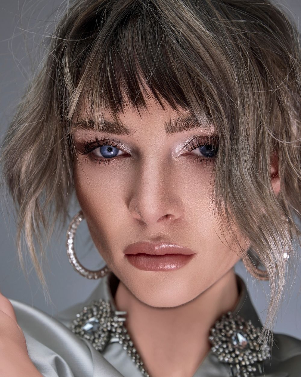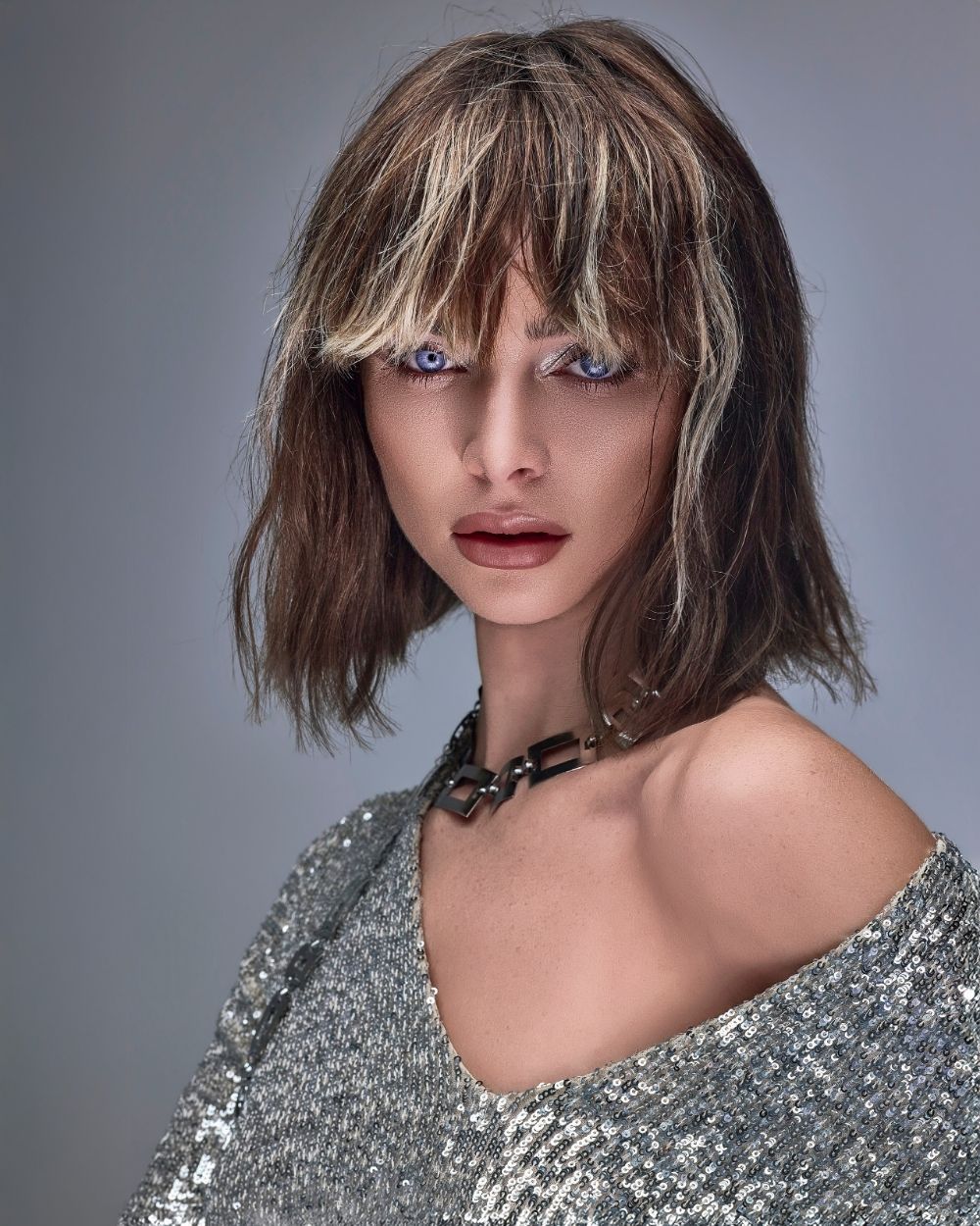 La atmósfera es mineral, luminosa, casi futurista. El cabello captura la luz como una joya, oscilando entre la fuerza y la fragilidad, el control y la entrega.